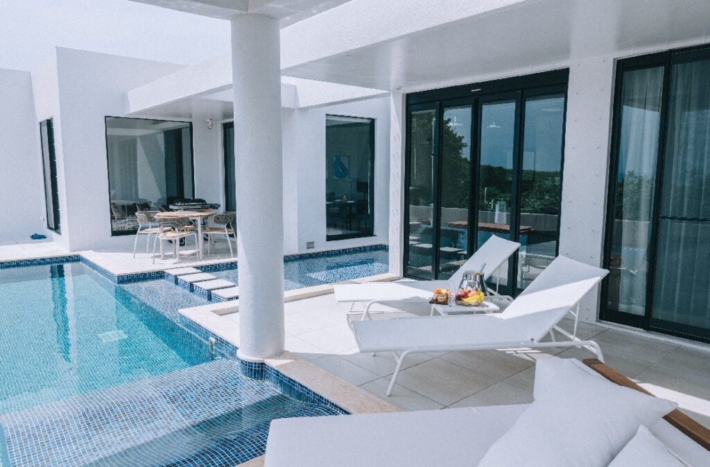 白を基調として、差し色に緑を使用したお部屋になっており、プールもあり、