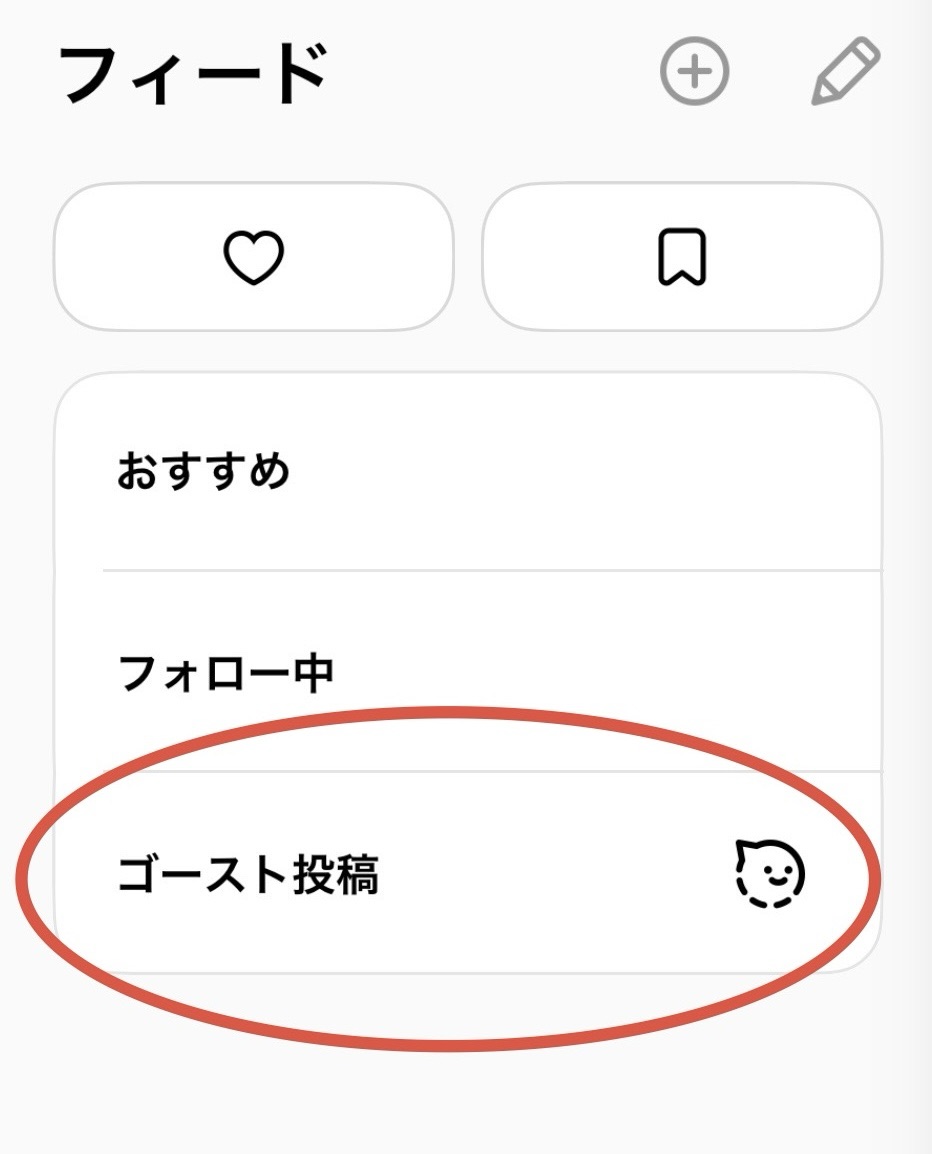 - 「おすすめ」「フォロー中」の下に「ゴースト投稿」というカテゴリーが表示されるので、タップする。(お化けアイコンついてます)